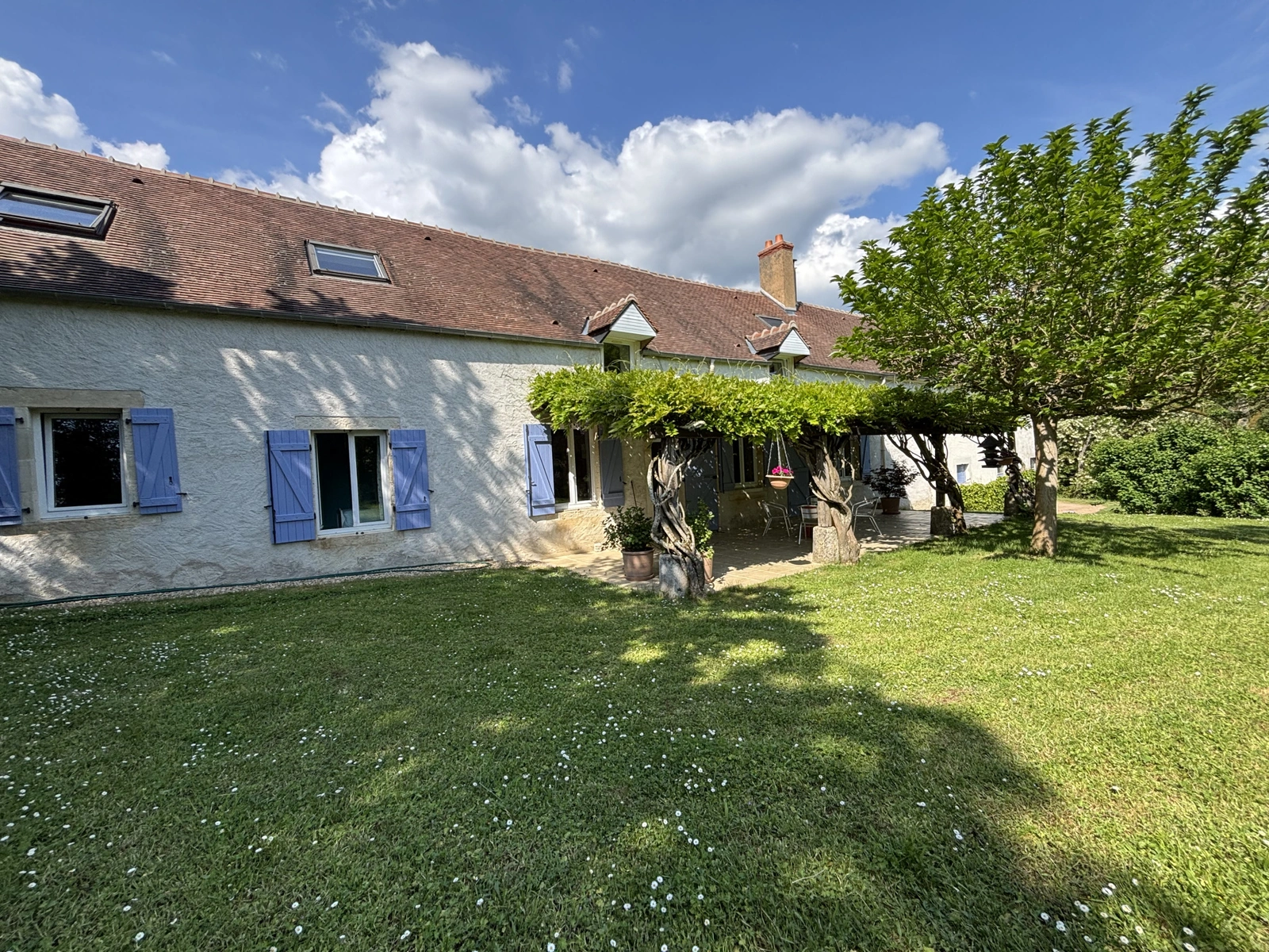 Cuisine aménagée et équipée, ouverte sur une terrasse ombragée par une glycine